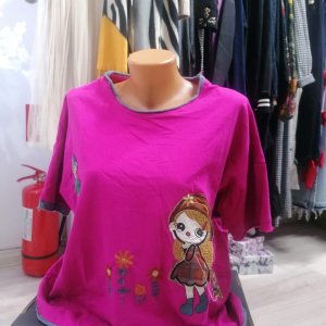 Tricou pentru femei, confectionat din bumbac, este un model mai lung, cu despicatura laterala. Se potriveste constitutiilor L-XL...