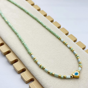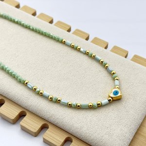 Colier fashion, confectionat din margelute de nisip, culoare verde pal-turcoaz, margelute foarte mici, delicate. Are lantisor metalic pentru ajustarea lungimii. ..