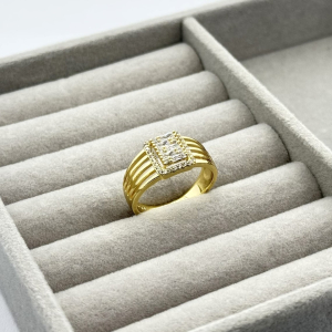 Inel placat cu aur galben 18k in strat de 3 microni, o bijuterie eleganta si proeminenta, accesorizata cu mici cristale Zirconia stralucitoare. Este disponibil pe masuri, nu contine nichel si este permis contactul cu apa...